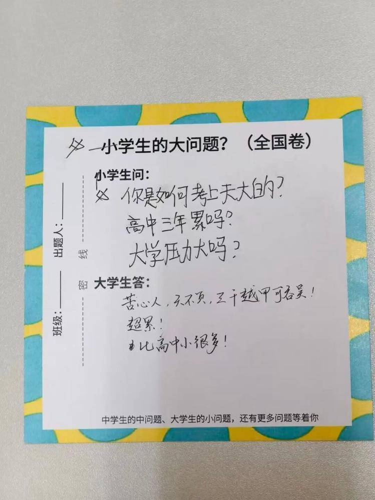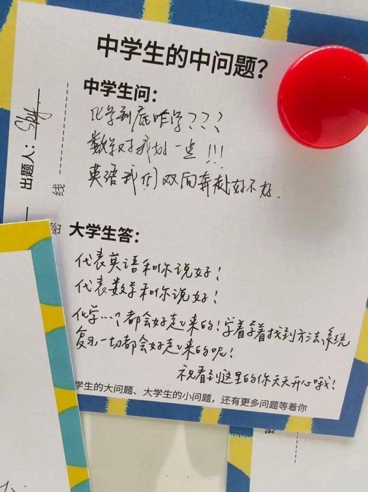 看板上,大学生写困惑,小学生用童真作答;小学生提问题,大学生则报之以深刻思考;中学生学习遇到挫折,大学生给予温暖鼓励……在这样的小卡片前驻足片刻,“大朋友”和“小朋友”都获得了治愈和能量。